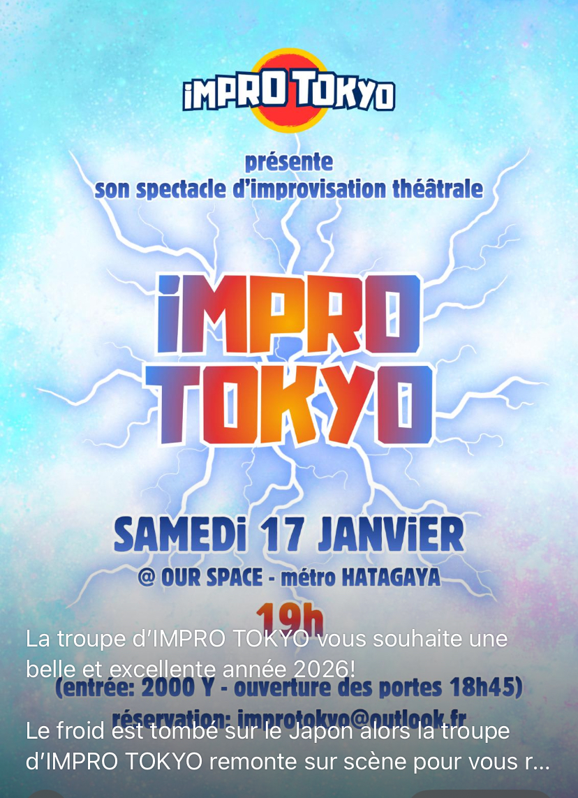 Let us start the year in laughter and in français with ImproTokyo. The French troupe will pick themes from the audience and improvise. On January 17th, Our space Hatagaya. Always a good time in a very French atmosphere.