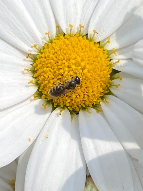 キンケハラナガツチバチ(土蜂科)megacampsomeris prismatica femelle (apidés-hyménoptères), 16-27mm, usuellement vue de juillet à octobre. On la voit en plaine comme en montagne, elle pollinise tous types de fleurs. Elle parasite les larves de coléoptères, et notamment de Mimela splendens (コガネムシ)