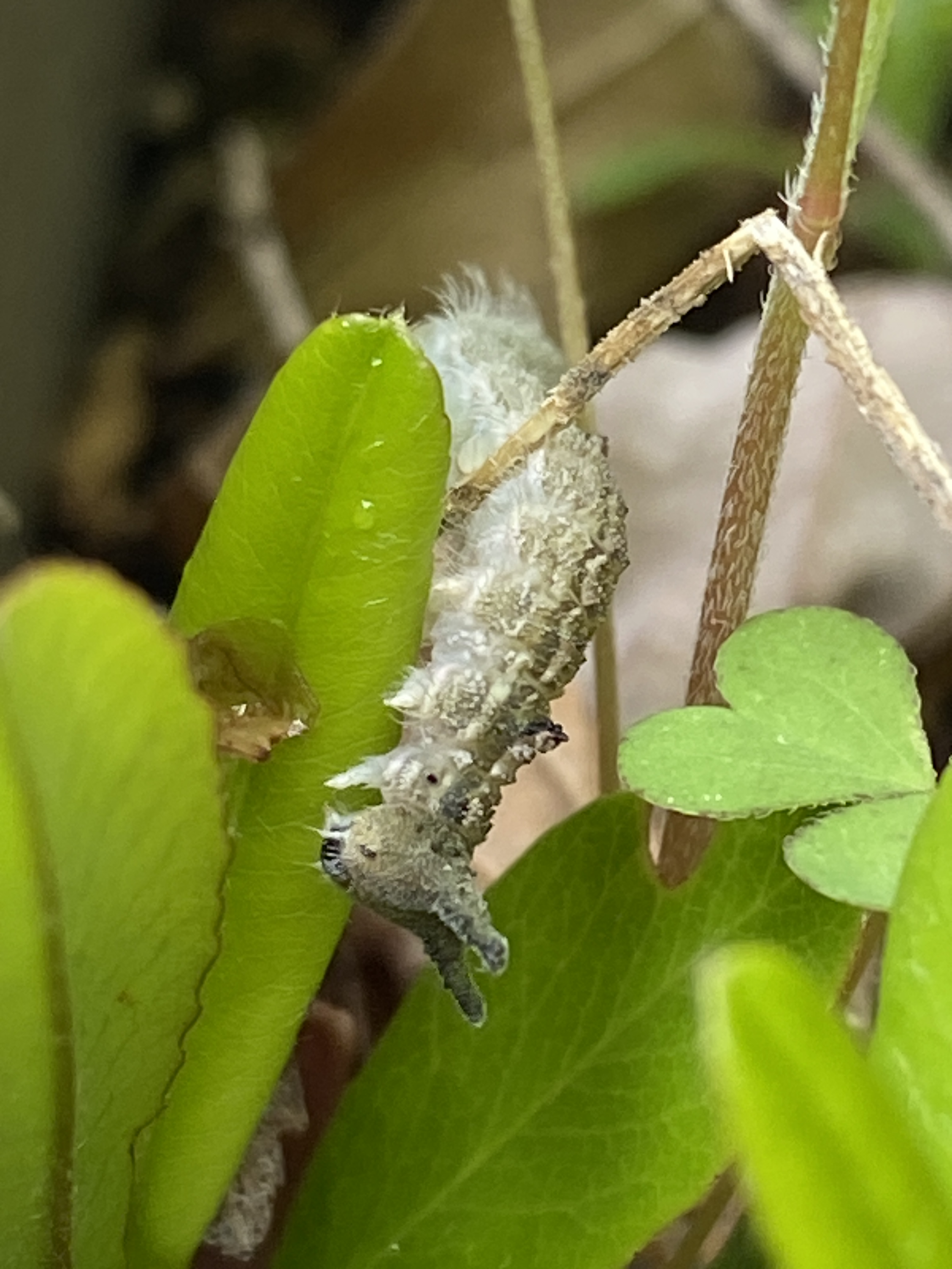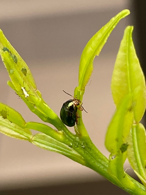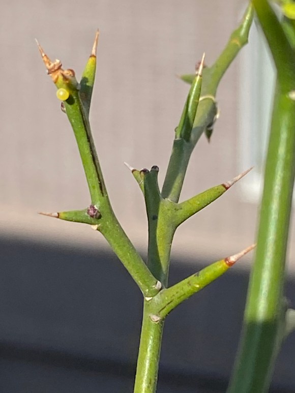 Oeuf de papilio xuthus. Les premiers specimen de papillons ont été aperçus au tout début du mois, le premier oeuf a été découvert 3 semaines plus tard, incluant donc un cycle de reproduction.