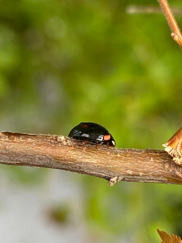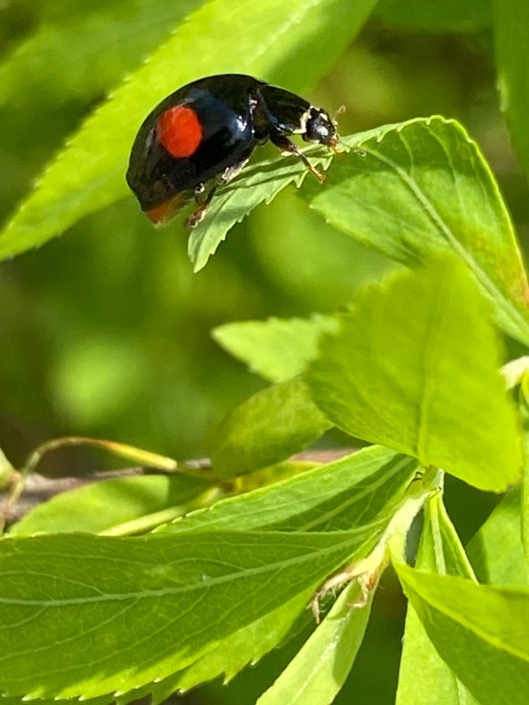 カリプソテントウ(テントウムシ科)coelophora saucia, coccinelle coelophore, (coccinellidés-coléoptères). En quête de pucerons sur un saule des neiges (yukiyanagi). A distinguer d’harmonia axyridis et phrynocaria congener, qui présentent aussi un gros point rouge sur chaque élytre noire, par la coloration blanche au niveau de la tête. Se nourrit de pucerons. En