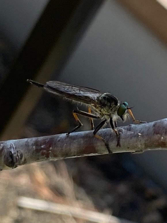 マガリケムシヒキ(ムシヒキアブ科)Neoitamus angusticornis, (asilidés-diptères), 15-20mm, avril-aout. 561. Les asilidés, mouches à toison, sont des prédateurs spécialisés. Leurs pattes longues et épineuses servent au maintien des proies, et elles sont dotés d’un appareil buccal robuste avec un rostre surmonté d’un mystax, moustache destinée à protéger les yeux de l’insecte des mouvements défensifs de la proie. Neoitamus angusticornis se nourrit de coléoptères.