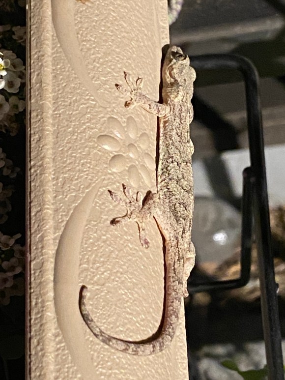 Gecko japonais, rôdant sur la terrasse en soirée.