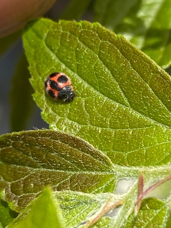 テントウムシ(テントウムシ科), larve de coccinelle (coccinellidés-coléoptères). Dans le parc d’Otsuka, les buissons frottent des rambardes, et les larves de coccinelles, perdues, s’y retrouvent en nombre.