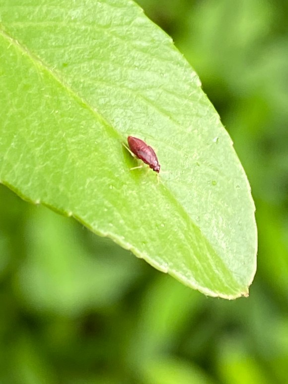 ダンダラテントウ(テントウムシ科)、larve de cheilomenes sexmaculata (coccinellidés-coléoptères), mars-novembre. La première coccinelle a été observée dans l’arrondissement de Toshima le 12 avril, les premières larves ont été aperçues le 26 avril, soit deux semaines plus tard. Les larves de coccinelles présentent une grande variété, à l’image des individues adultes. En général le corps est noir, ou gris, et présentent des motifs variés, en rouge ou blanc, parfois en jaune. Il y a aussi une variation de pilosité et bien sûr de tailles. Cette larve de cheilomenes se trouve sur une feuille de saule des neiges (yukiyanagi).
