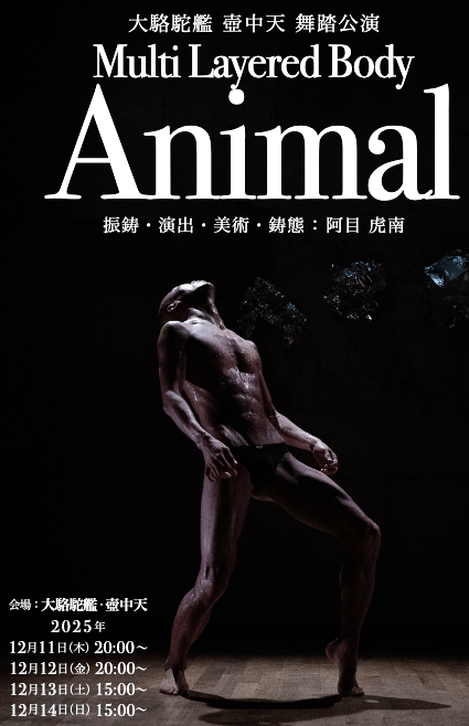 Dairakudakan presents a one-man butoh performance by Konan AMOKU / Conan Amok, Multilayered body animal, from December 11 to December 14th, in Kichijoji, Tokyo. Kochuten, the paradise in a jar, the 50-seats venue of the oldest existing butoh company (est.1972), has re-started their regular spectacles / producings. After Jongye YANG Rite of spring all female Dairakudakan members sold-out performances in November, and before Shinshoku (March 2-8), it is a perfect time to taste Butoh pieces blessed by Akaji MARO, who is acting as artistic director for this piece. For more information on Dairakudakan / Kochuten programs, and on Butoh in 2025 and beyond.