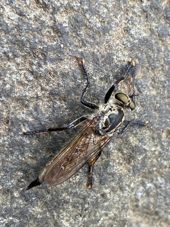 サキグロムシヒキ(ムシヒキアブ科)Machimus scutellaris, (asilidés-diptères), 20-26mm, juin-octobre. 560. Les asilidés, mouches à toison, sont des prédateurs spécialisés. Leurs pattes longues et épineuses servent au maintien des proies, et elles sont dotés d’un appareil buccal robuste avec un rostre surmonté d’un mystax, moustache destinée à protéger les yeux de l’insecte des mouvements défensifs de la proie. Se nourrit de papillon, notamment de piérides, dont il aspire les fluides vitaux.