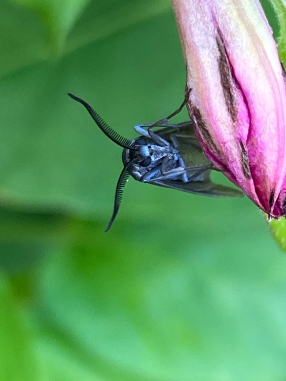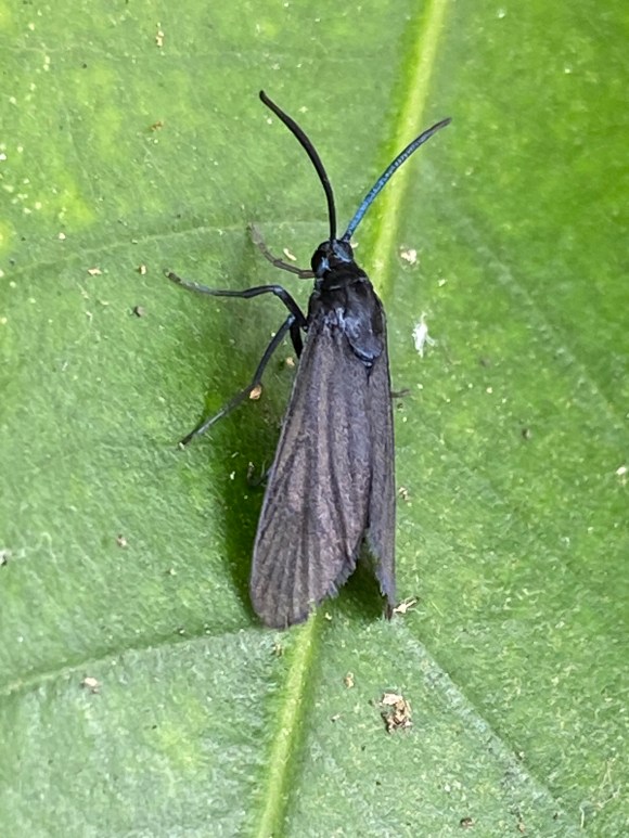 ウメスカシクロバ、マダラガ科)Illiberis rotundata (-lépidoptère), 16-25mm, juin-juillet. 152. Ailes translucides, corps noir. Ses larves, urticantes, se nourrissent des feuilles de cerisier, prunier, pêchers.