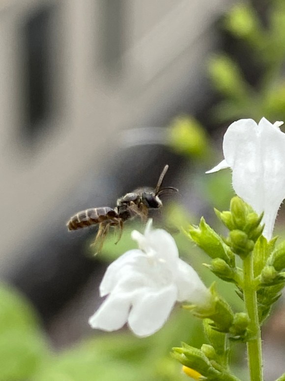 ヒメツツハキリバチ、(ハキリバチ科), megachile subalbuta (apidé-hyménoptère), 7-10mm, mai-septembre. 734. En vol d’approche sur des fleurs de calaminthe.