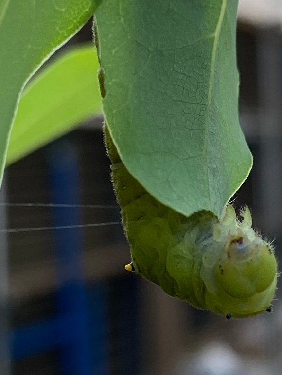 アゲハ、(アゲハチョウ科), Papilio xuthus (papilionidés-lépidoptères), machaon du japon, 35-60mm, mars-novembre. Derniers instants avant de devenir une chrysalide. On distingue bien le fil de soie qui la retient.