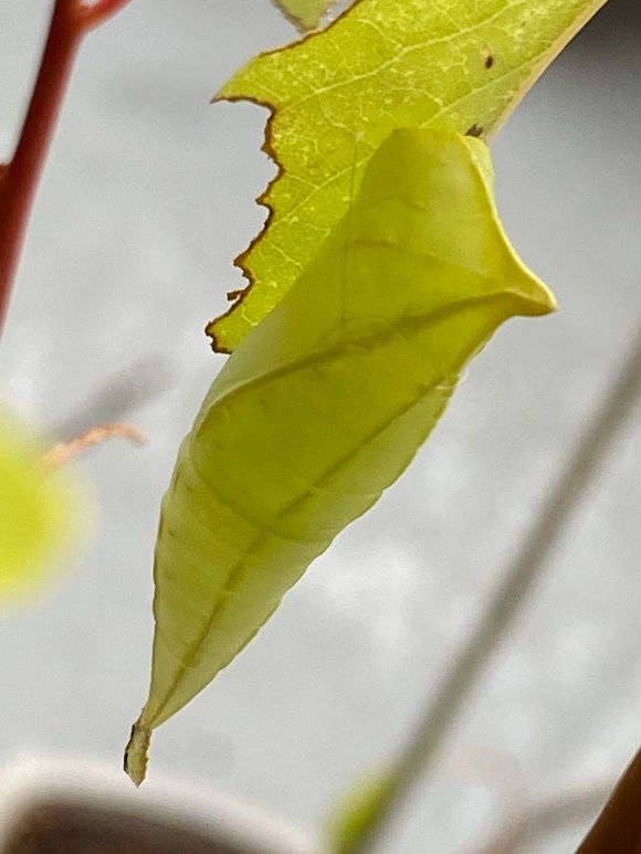 Oeuf de papilio xuthus. Les premiers specimen de papillons ont été aperçus au tout début du mois, le premier oeuf a été découvert 3 semaines plus tard, incluant donc un cycle de reproduction.