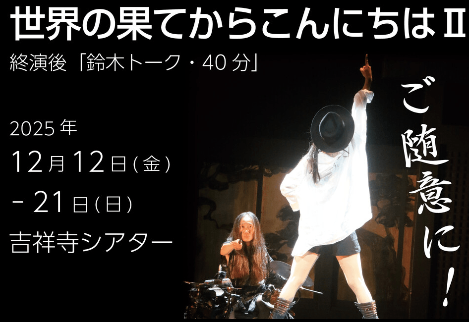 Zazi-Zoo Contemporary Counterfeit Theater, a new performance by the energetic Zazi.Zoo energetic and passionate theatre collective from Tokyo, an experience in an intimate transformed garage, in Yokohama, with English surtitles.